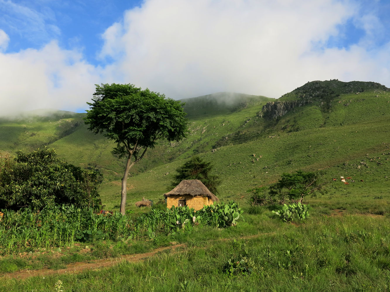 Roughly following the directions of my track, I eventually came to a beautiful little basin covered on all sides by grassy slopes, with several creeks running through it. To my delight, I spotted a proper trail near the end of the basin on the other side of a creek. By now the sun had come out and I was in high spirits, leaving behind the gloomy could forests of the summit ridge… It was pretty smooth sailing from here on. All I had to do is follow this trail, through meadows and forests, down into the valley. Near the bottom I reached a small hut with a group of women standing in a nearby field. They seemed surprised to see me and asked where I had come from. Using lots of gesturing, we somehow managed to communicate and had a good laugh together. There were several trails through the fields now and they kindly showed me the way get back to Kanjonde.