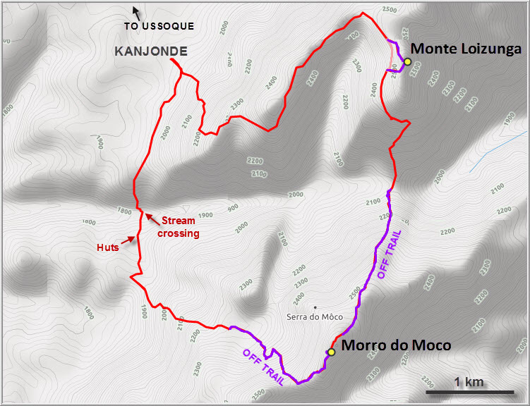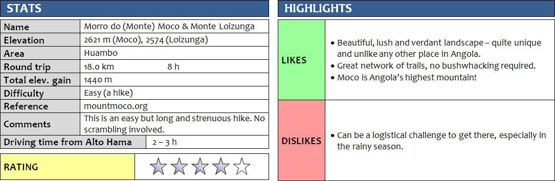 This loop was a beautiful hike, very different from all the others I’ve done in Angola. While there were no technical difficulties, it’s a long trip that took quite some energy out of me. The climate is cooler and the land lusher up here, and walking along the gentle ridges and valleys of the Serra de Moco is definitely a unique experience.