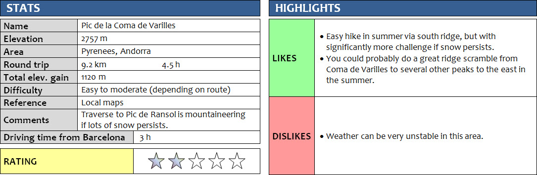 Pic de la Coma de Varilles. Snow covers much of the mountain’s SW slopes. The south ridge (right side) is mostly snow-free.