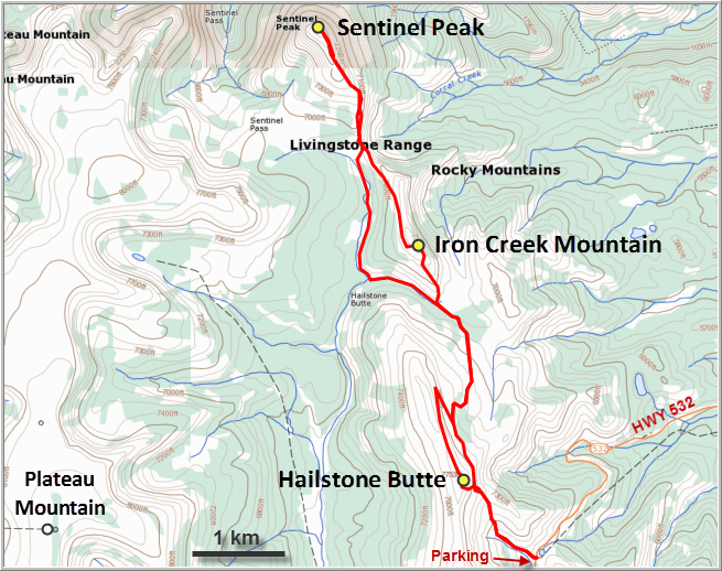 Hailstone Butte and Sentinel Peak are easy day hikes described in detail in Daffern’s K-Country guidebook (Vol. 5). There are several different ways to approach them and we decided to make a loop to combine them both and include a small peak called “Iron Creek Mountain” (on Gaia’s OpenHikingMap) as well.