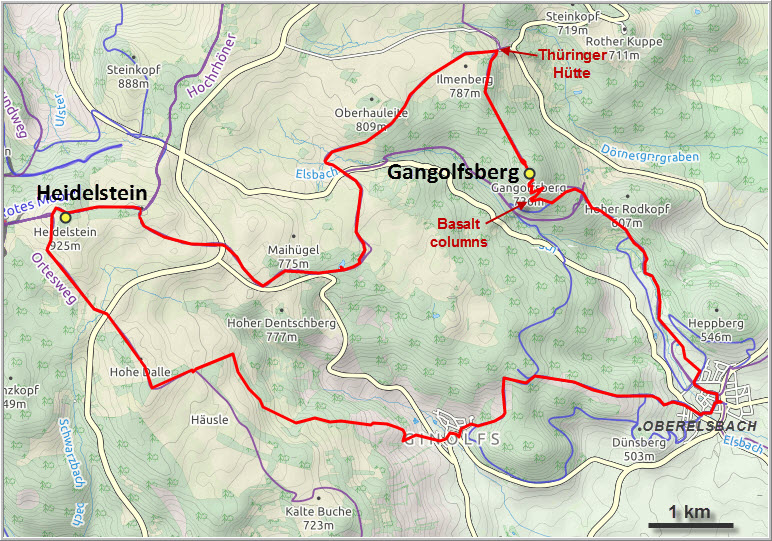There is a nice quiet trail leading towards the Gangolfsberg from the village of Oberelsbach along a brook called Els, from which the name of the settlement is derived. Much of the trail is in the forest, including the unspectacular summit, so views are limited. The highlight and main draw of the Gangolfsberg hike are the outcrops of well-preserved basalt columns that can be observed close-up in various orientations. The most famous site is the “Prismenwand”, a wall of basalt “prisms” sticking out sideways and giving a cross-sectional view of these four- to six-sided columns. Other outcrops show vertical columns of basalt some 5 to 10 m high. There’s even a staircase with steps made of basalt boulders! The basalt is part of a former volcanic intrusion that formed the Rhön Mountains during the Tertiary, between about 30 to 10 million years ago. Many of these outcrops were mined in recent history as basalt is prized as a particularly resistant type of rock useful in highway construction for example.