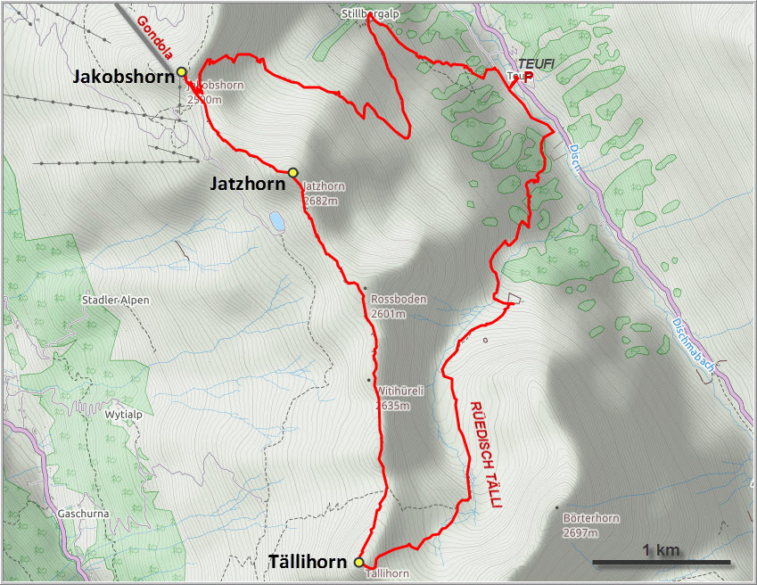 There is a very good trail along the ridge that goes south from the Jakobshorn via the Jatzhorn to the Tällifurgga pass, where one can either descend west into the Sertig Valley or east into the Dischma Valley back to Teufi. My parents had done the ridge walk before, but neither could remember how many ups and downs there were along the way! It was very enjoyable and in the end a bit more strenuous than they had thought – but then again, what pensioners in their 70s and 80s can still conquer mountains and overcome 500 metres of elevation gain, not to mention the 1200 m descent that followed?! They are simply in impressive shape and I am hugely proud of them!!
