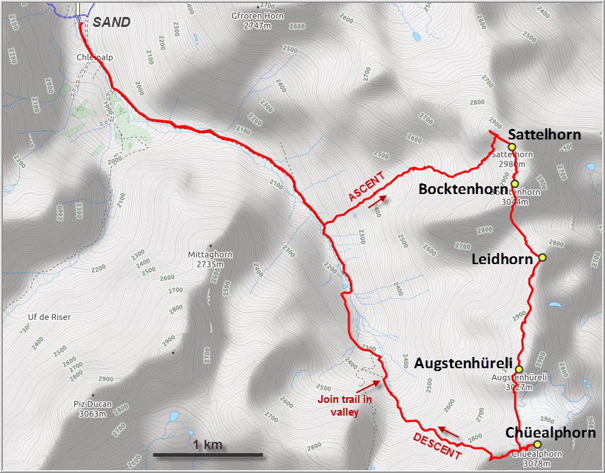 After getting the difficult downclimb off the west ridge behind me, I continued – with much relief – along the jagged ridge westward with the aim of making it down to the Sertig Pass, from where a good trail leads back down the valley. About a third of the way along, I came over a bump and saw the last part of this ridge: nasty-looking, craggy, sharp and with another considerable elevation gain! The official SAC guidebook only mentions “the ridge can be tackled head on or the most difficult sections bypassed on the sides”, but to me it didn’t look scrambler-friendly at all! I had been hiking for more than 8 hours and still had at least 2 hours to get back to the car, so it was an easy decision: head straight back down the valley via scree and grassy slopes and hook up with the trail then. There were some scree skiing sections higher up, but the rest was pretty tedious and I was glad when I reached the excellent trail which took me back to the restaurant at the village of Sand in no time.