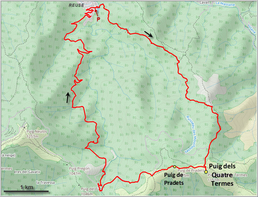 Our second outing in the Pyrenees, again in the fairly gentle Albera Massif of French Catalonia. This time we drove up as high as we could to the small hamlet of Reuse in the Vallée Heureuse (“Happy Valley”), where a decent trail starts up the ridge towards Puig (or Pic) dels Quatre Termes.