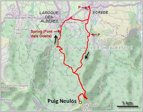 Instead of heading back the same way to Sorède, we stuck to the advice of a French hiker we met at the summit and descended via another, more well-trodden path down to the village of Laroque. As on the hike up, it was mostly through lush, beautiful forest and once again there was no one else around until we came close to the village. A small fresh water spring called “Fonts dels Ocells” at the entrance to Laroque provided a welcome refreshment after nearly 7 hours of sweaty hiking! From Laroque it was a leisurely 2 km walk back to Sorède.