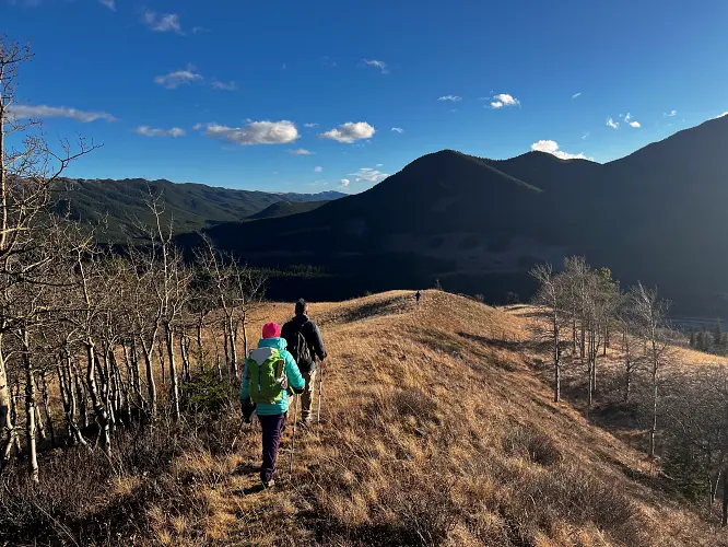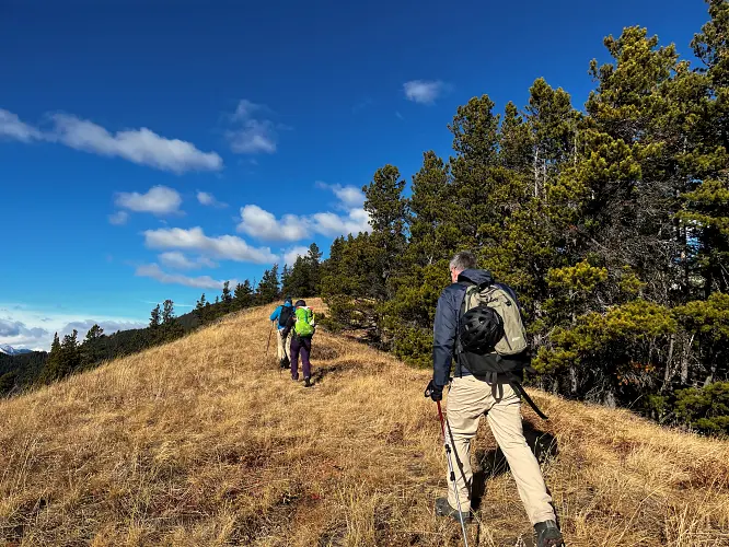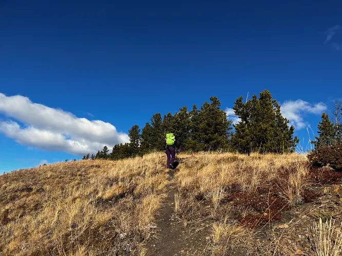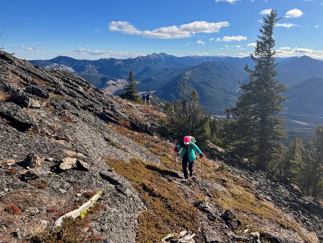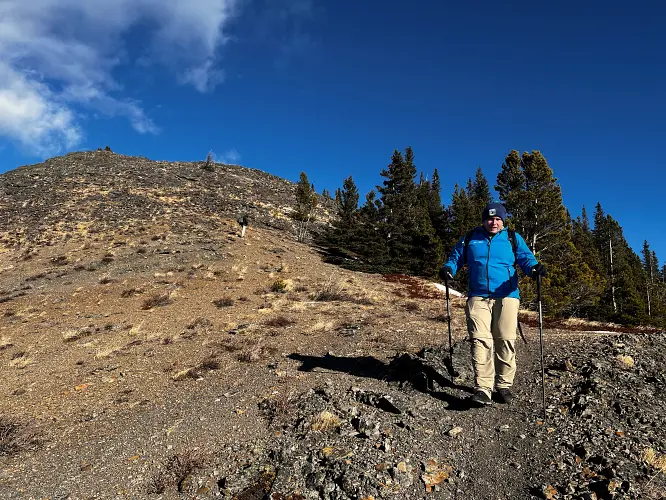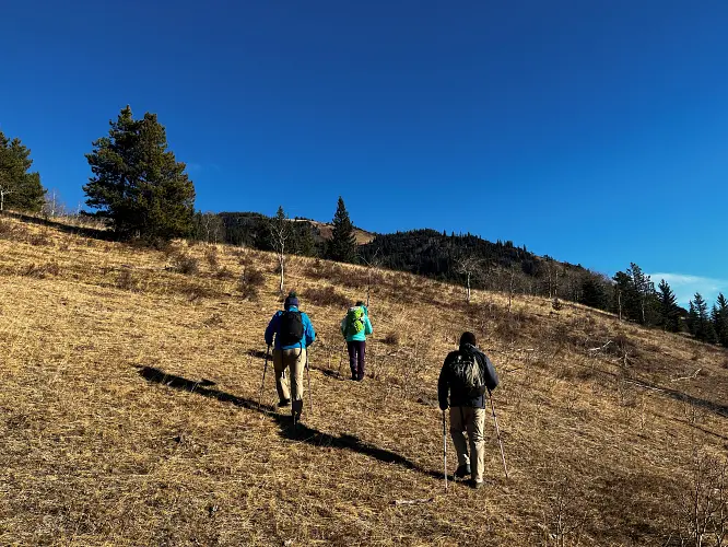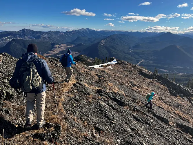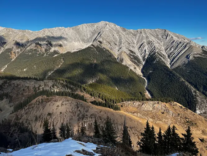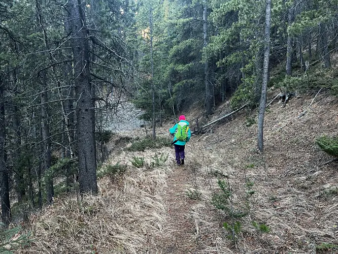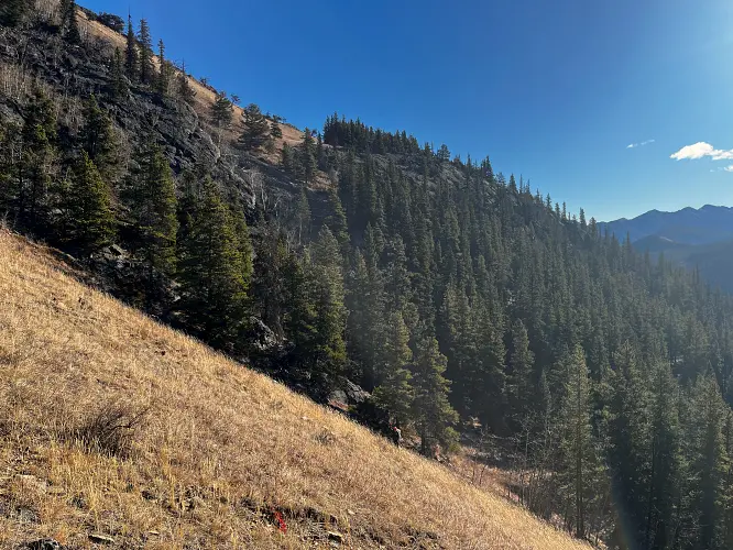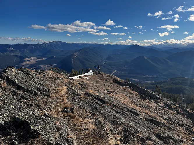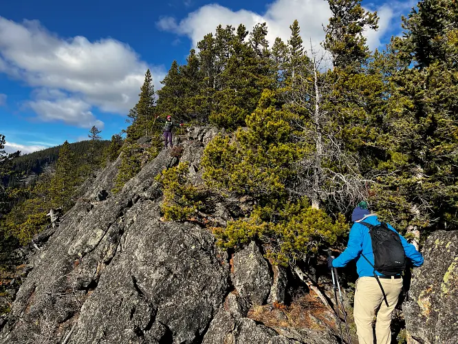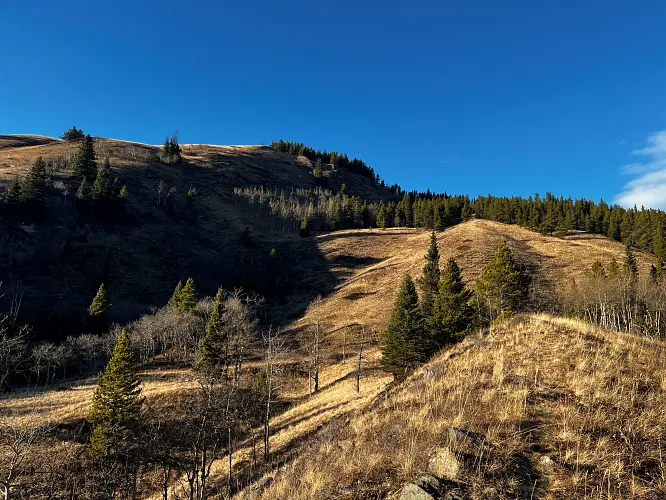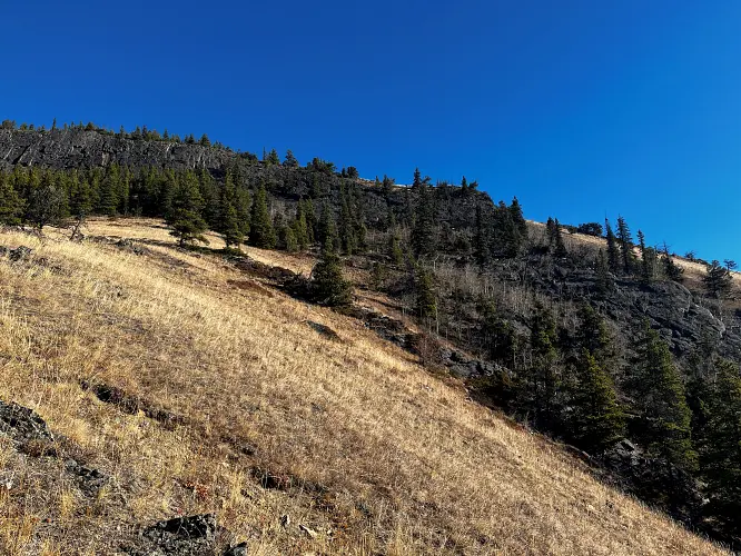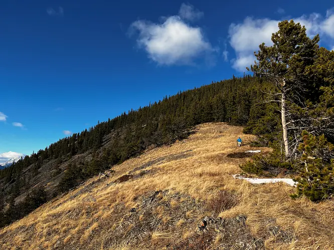 We parked a few hundred metres before the winter gate on the side of the road and just headed straight up the grassy hillside towards the northeast, aiming for a break in a prominent cliff that hugs the southeast ridge. Almost the entire hillside as seen from the road is sun-facing and thus mostly dry even when other nearby ridges and peaks are snow-clad. We easily walked up some steep, grassy hills with a few stands of trees here and there, to the break in the cliff which is marked by a few trees and a faint game trail that lands you right on top of the southeast ridge.