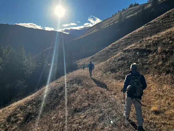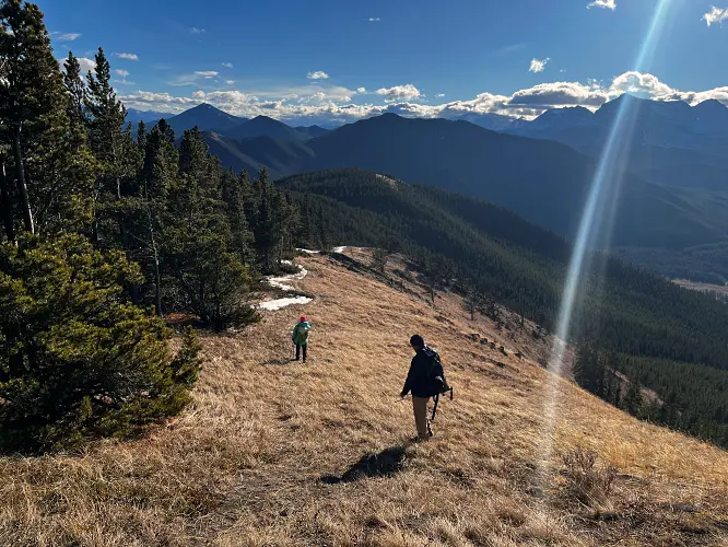 Instead of returning the same way we took the south ridge on the descent. The faint trail here is intermittent, but about two thirds of the way down we linked up with an old exploration road that lazily snakes its way down the hillside, eventually fizzling out in open grassy slopes just above the road. A super straightforward and easy-going hike!