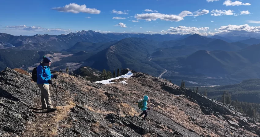 We parked a few hundred metres before the winter gate on the side of the road and just headed straight up the grassy hillside towards the northeast, aiming for a break in a prominent cliff that hugs the southeast ridge. Almost the entire hillside as seen from the road is sun-facing and thus mostly dry even when other nearby ridges and peaks are snow-clad. We easily walked up some steep, grassy hills with a few stands of trees here and there, to the break in the cliff which is marked by a few trees and a faint game trail that lands you right on top of the southeast ridge.