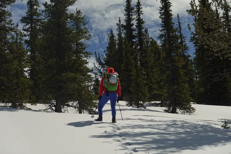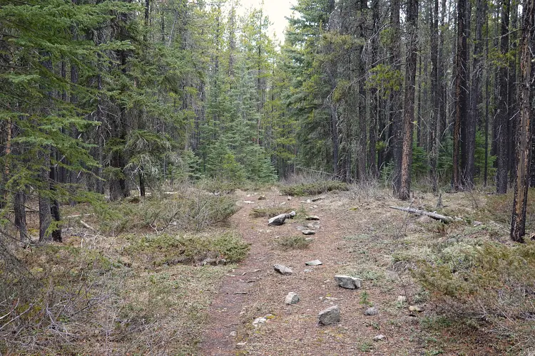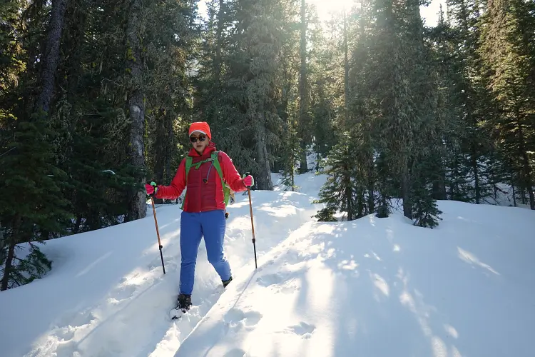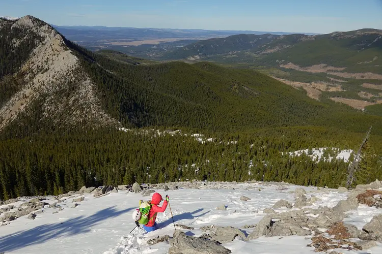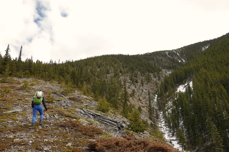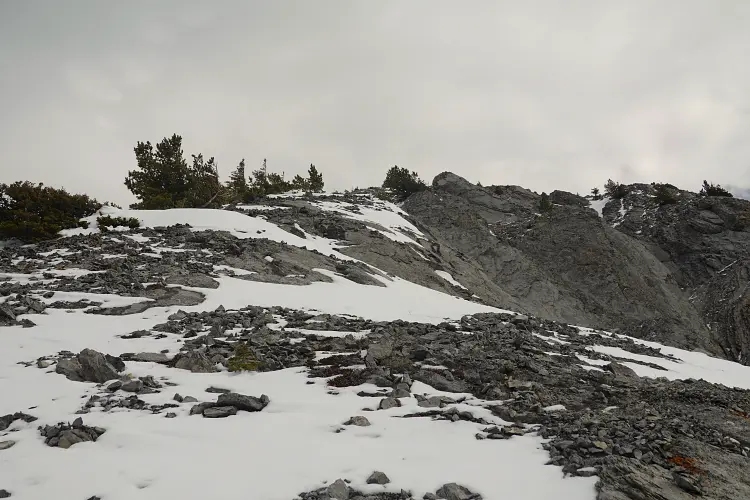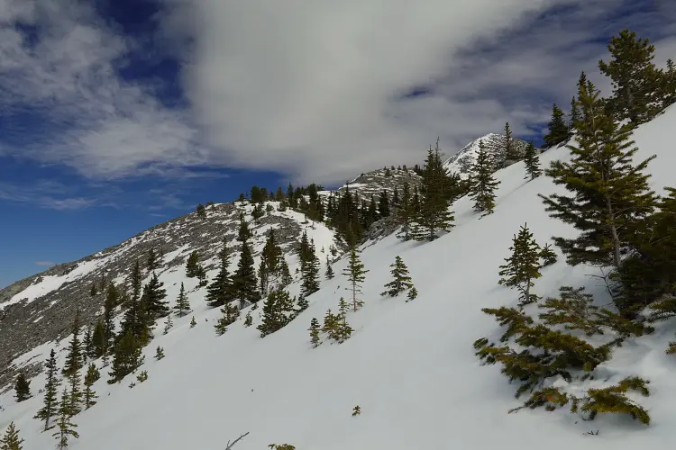 From the Baldy Pass parking area we crossed the road and first followed the good trail for about 850 m to the Baldy Pass turn-off. Instead of turning left and heading up to the pass, we continued south along a less-travelled trail for another ca. 450 m before branching off to the east and heading up a wide drainage. After a few hundred metres, it became easier to enter light forest covering the lower part of the west ridge. There was no bushwhacking to speak of and the trees quickly gave way to a semi-open ridge crest that was easy to follow up. The only stretch where we briefly had to wade through some knee-deep snow was in a small forested area just before our ridge was joined by another minor ridge coming in from the southwest.