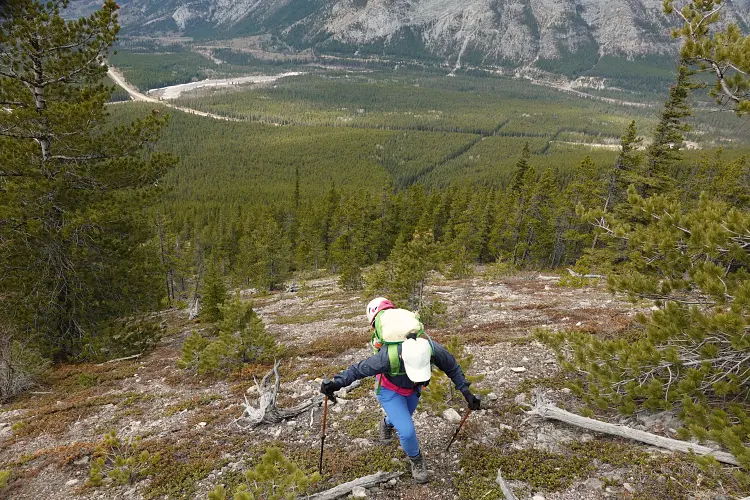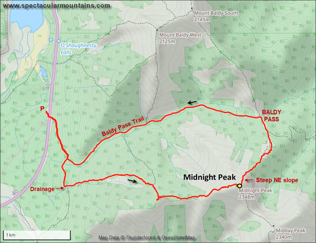The “normal” route is to take the well-established trail from highway 40 to Baldy Pass, then turn right and hike through trees to the aforementioned steep slopes and on to the summit. We decided to try out an anti-clockwise loop route up the west ridge of Midnight Peak, then down the normal route. It worked out really well.