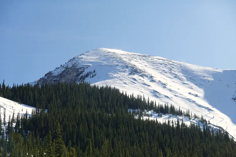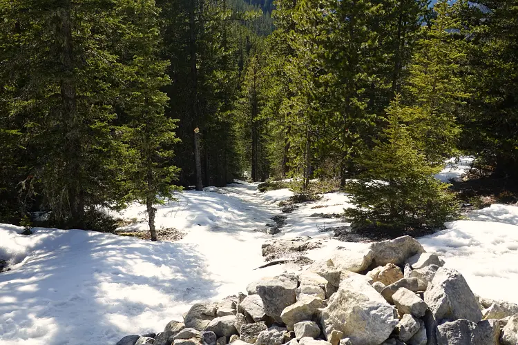 Past this point we traversed a small dip and then left the trees behind for good and enjoyed a lovely ridge walk at a steady grade to the summit. Just like on previous visits I was quite taken by the beautiful sight of neighboring Midday Peak, which can be reached in about an hour from Midnight (easy scrambling). With a very late start, we were quite content with one summit today and after enjoying wintry Kananaskis views proceeded to head down the snow-covered northeast slope. The snow was firm and supportive, and the tracks from a previous party a day or two earlier were certainly helpful. It’s steep, but short, and soon we found ourselves in the forest again following a good trail down to the saddle at Baldy Pass. You can tell the pass sees frequent visitors by the amount of ice on the trail back to the parking lot. Thankfully, we had brought microspikes which made the return a breeze.
