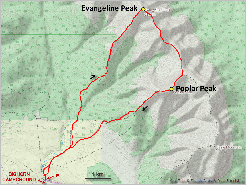 Since Vern and Steven published their trip reports on Evangeline and Poplar (Rum Ridge), many people have followed in their footsteps to do this fabulous outing, including myself. And for good reason – in my opinion this is a hugely enjoyable trip that combines easy access, pleasant ridge hiking and some fun, hands-on scrambling all in one.