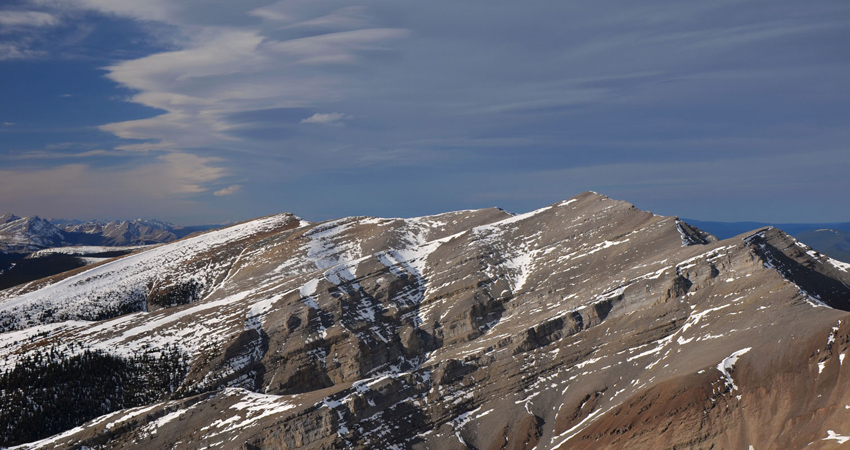 Overall, the majority of this ridgewalk is pretty easy in terms of technical difficulty. There is one particular cliff band on the connecting ridge, however, that can be tricky if icy or covered in snow. Thankfully, the rock was mostly bone dry today and a delight to scramble down. Strong gusts of wind were whipping me around as I plodded along the open ridge to the high point between the two peaks. The wind really took a lot of energy out of me and I decided to sit down and rest for a while once I reached the double summit of Poplar Ridge. Interestingly, this ridge is variously referred to as Poplar Ridge and Rum Ridge in different sources and on the official Ya Ha Tinda ranch map, so I assume they mean the same thing.