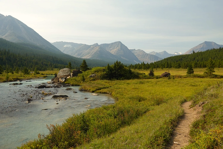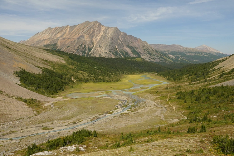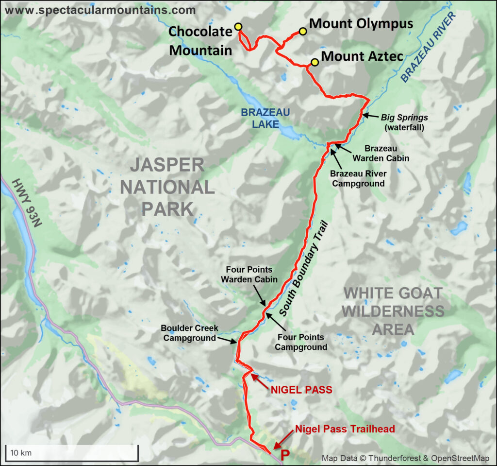 There are two logical approaches to Chocolate Mountain, both from the Icefields Parkway (Hwy 93N). The first is via Poboktan Creek Trail, then off-trail over an unnamed high mountain pass to the north of Poboktan Pass, down a long valley to the Northwest Brazeau River, and up another smaller pass on the east side of the river. I contemplated doing this approach for a long time but ultimately chose the second option, an approach via Nigel Pass Trail further south, then along the South Boundary Trail along the Brazeau River, followed by off-trail hiking up a drainage and high pass near Mount Aztec and into unnamed valleys to the north. This route is longer but has the advantage of having more of the approach on a trail, plus it would allow me to tag on a couple of other mountains as well – Mount Aztec and Mount Olympus. Of course you could combine the two routes, but then you’d need two cars or hitchhike between trailheads.