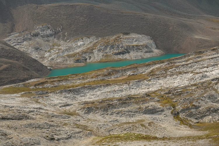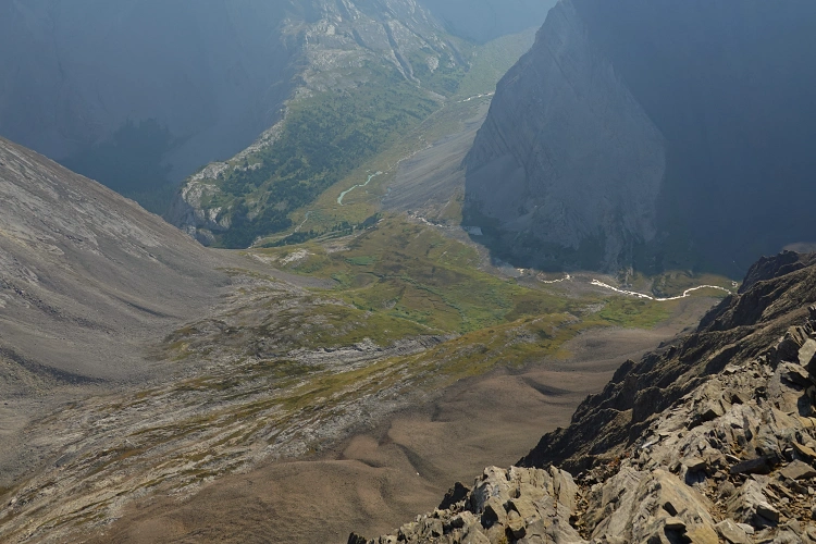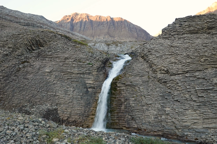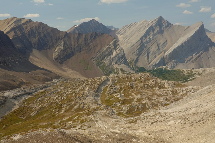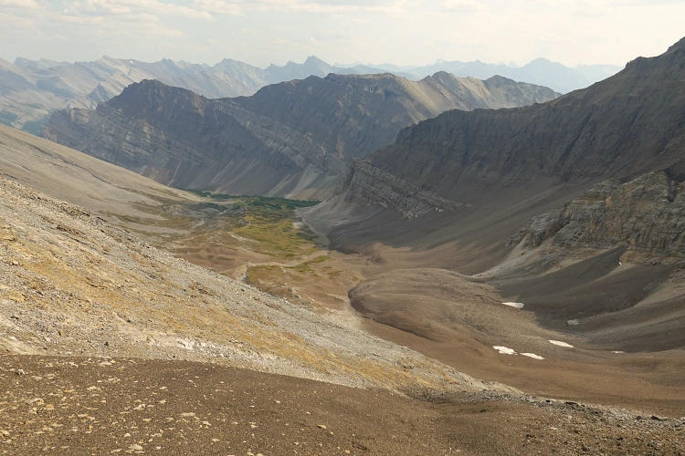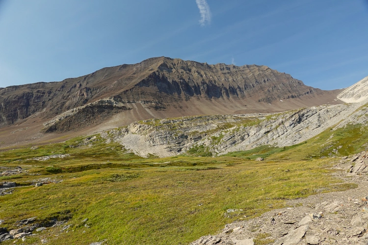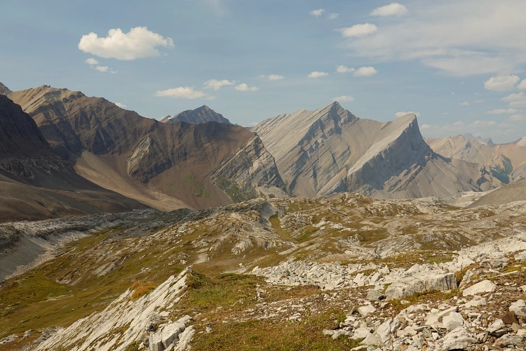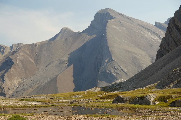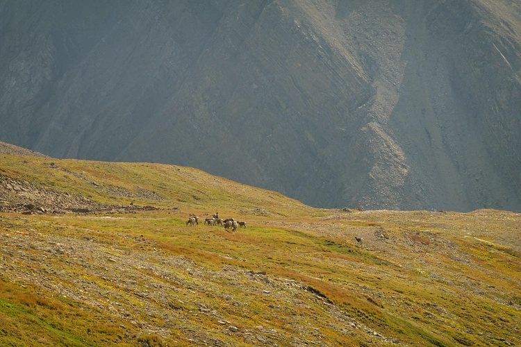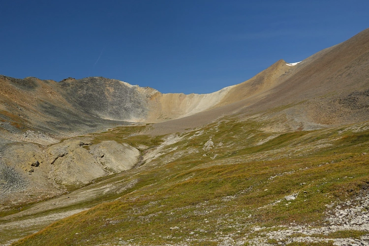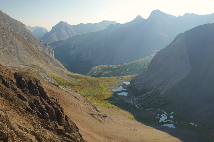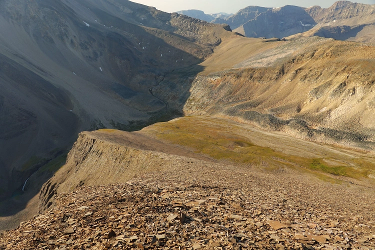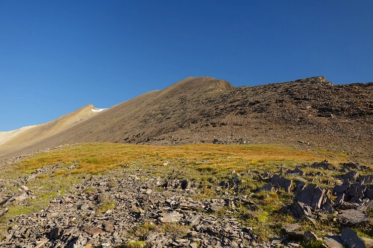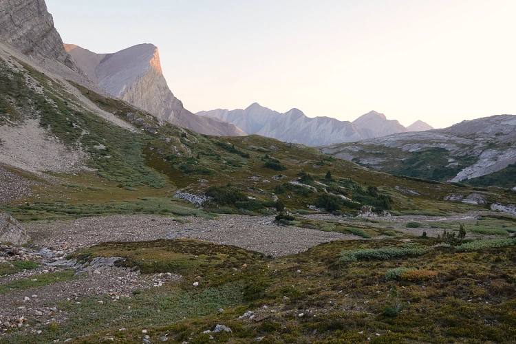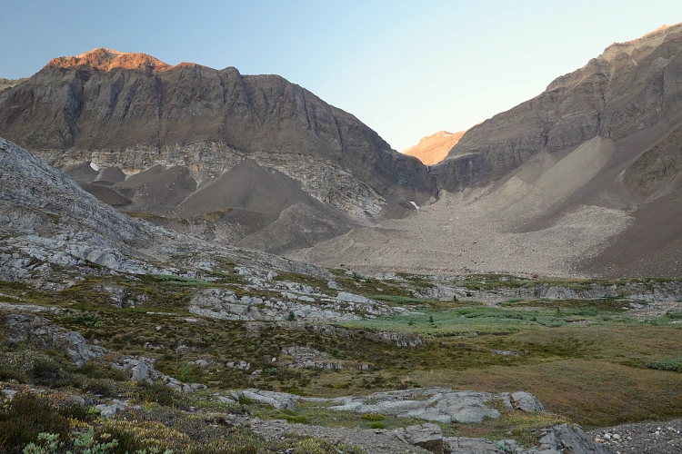 The brown shale that featured an easy goat trail on the south ridge also provided a delightfully soft scree slope on the southwest side of Chocolate Mountain, allowing for a quick and convenient descent into the broad upper valley southwest of the peak. At the base of the scree the terrain transitioned into gentle grassy slopes where a large herd of goats was grazing on the side of the valley. They didn’t seem too bothered by my presence but kept a healthy distance as I ambled down the open valley back to the start of the south ridge, connecting with my ascent route from the morning. I certainly felt much more relieved now that I just had to retrace my steps back to my tent, knowing that the route was straightforward and enjoyable at the same time. With the sun at a very different angle now, I couldn’t help but stop frequently to take lots of photos of this wondrous place.
