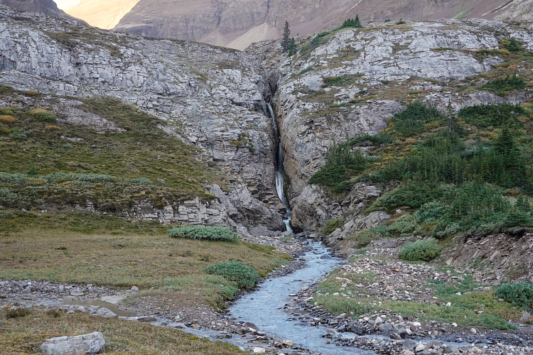 Another smaller waterfall at the base of the headwall. To the north, the valley bottom is flat and offers easy hiking on the left side.