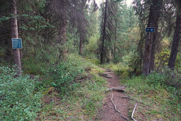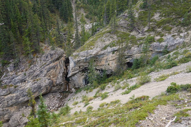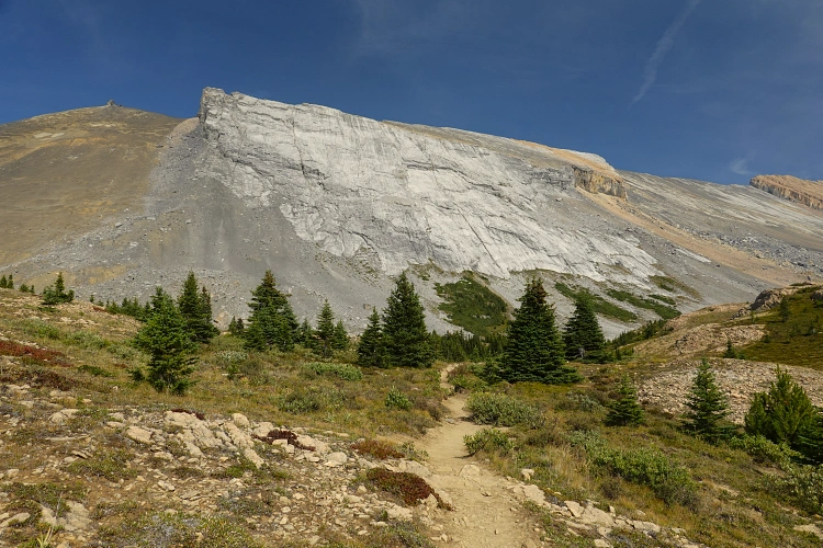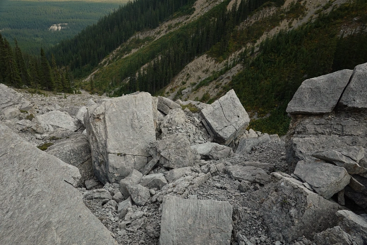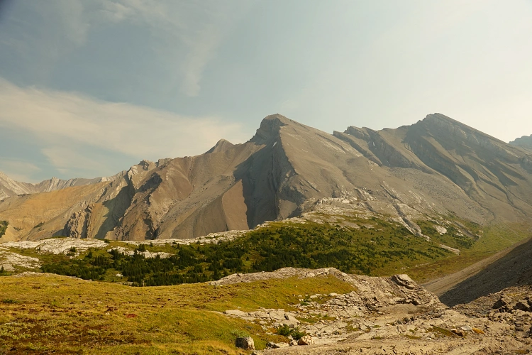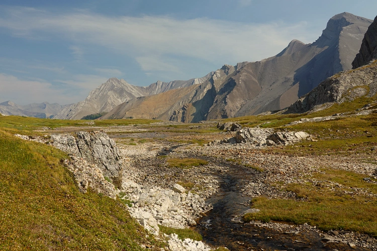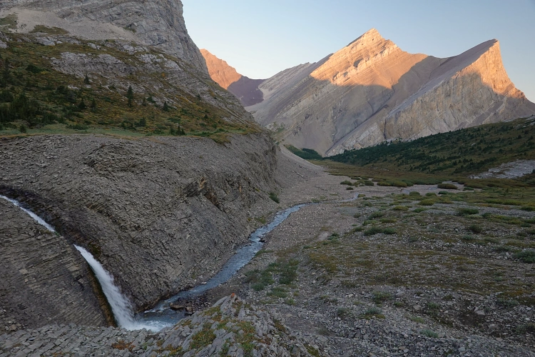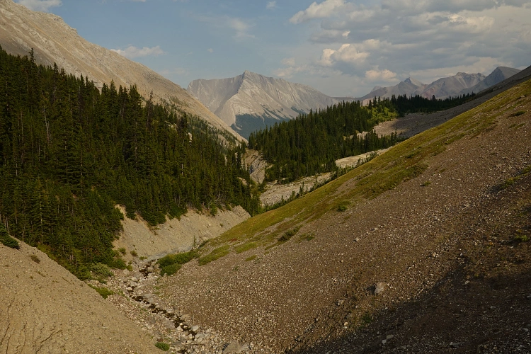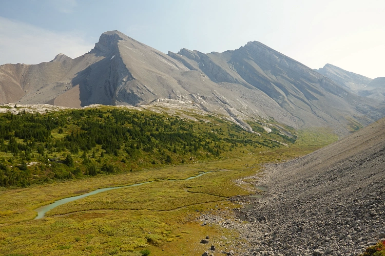 The slopes south of the pass are mostly covered in soft brown scree, which I could tell makes life easier for local game as well… the relatively fresh bear tracks I saw the day earlier could be seen in the mud, and I was wary that these magnificent beasts might be roaming somewhere in the valley below me. Calling out frequently, I fortunately didn’t encounter anymore wildlife other than some fat marmots and shy pikas. The remainder of the descent down the valley back to the trail was tedious and tiring, although much easier on the mind now that I knew the optimal route to follow. The sidesloping on rubble to avoid the two narrow canyons was especially hard on my already very sore feet, and downward travel wasn’t much faster than going up. Around 6 pm I finally made it back to the South Boundary Trail. Shortly after, as I was quietly trudging along in the forest, a huge black bear popped up right on the trail in front of me. It seemed flustered and quickly scurried away, in the same direction I was travelling. Now I had no choice but to yell out every 10 seconds as I completed the final few kilometres back to Brazeau River backcountry campground where I set up camp for my last night.