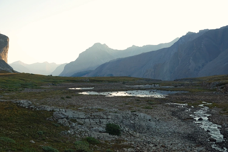 I got back to my campsite around 2 pm, my food stash still intact in the bear-proof bag sitting on a large boulder nearby. After a relaxing lunch break, I took apart my tent, packed up my big bag, and started the long return journey. Once again, knowing the terrain and exactly which way to go, how to bypass certain obstacles, and knowing what to expect, is such a huge relief and so much easier on the mind (and body). The mental challenge was 90% done at this point, the physical was a matter of putting one foot in front of the other and forcing myself to take enough breaks. Leaving the beautiful karst valley behind me and slogging back up to the Aztec pass was tough but I broke it down into small steps and made sure I picked the best line on competent rock in the middle of the drainage as opposed to steep rubble or loose scree on the sides. Half-way up I encountered a good flow of crystal clear water coming out of the rock, a welcome reprieve from the heat and much-needed source of hydration.
