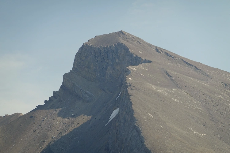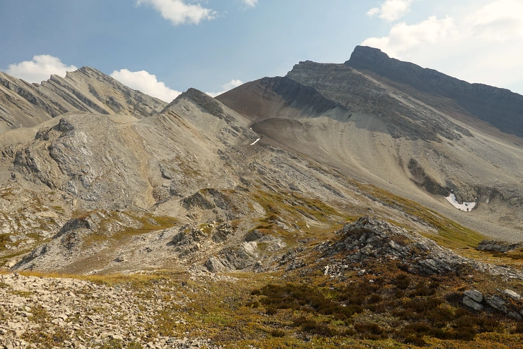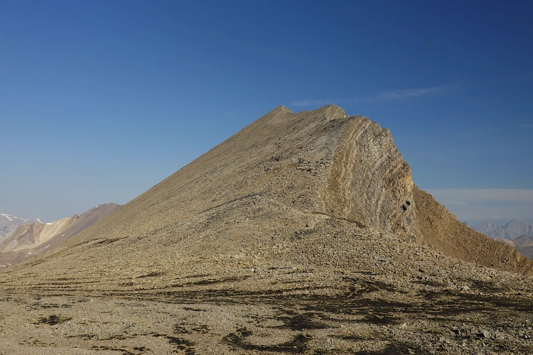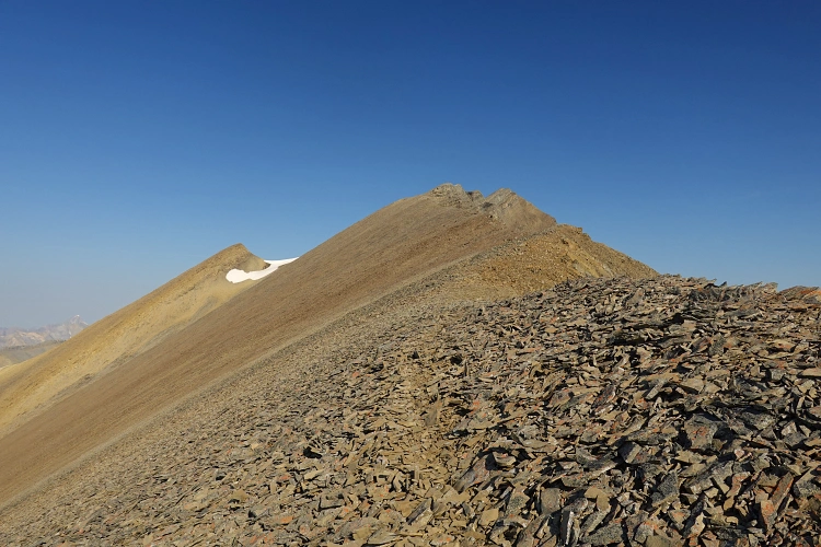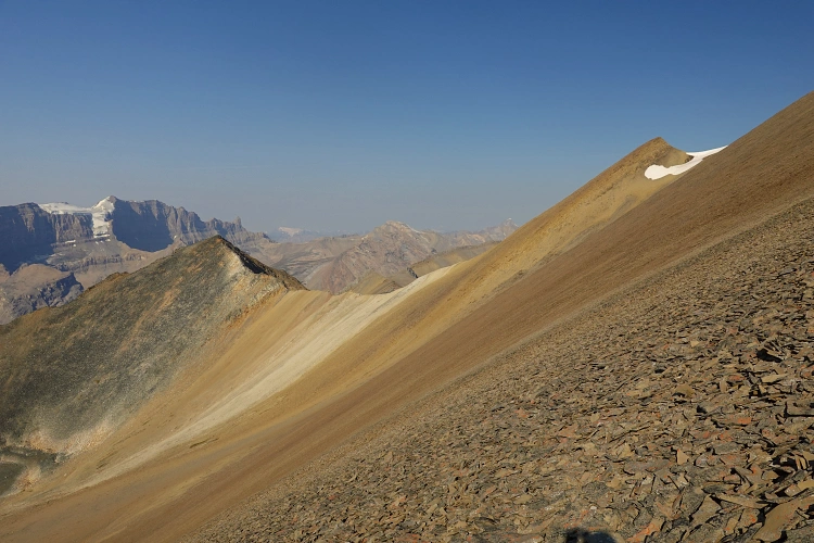 Almost the entire mountain is made up of medium to dark brown shale and siltstone, with a few layers of white limestone interbedded on the east side. The colours certainly do the name justice, even if we’re throwing some white chocolate into the mix :). More importantly for climbers, the presence of brown shale of course also means that there are likely not going to be any major difficulties. Shale is relatively soft and tends to break down and erode much more easily than other rock types, but it can also be loose and unpleasant. To my surprise, there was a fairly good goat trail right on the ridge crest and all I had to do is follow it almost all the way to the summit. It was an easy walk and I thoroughly enjoyed the views of the many unnamed peaks and distant glaciers on this gorgeous sunny day.