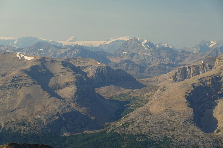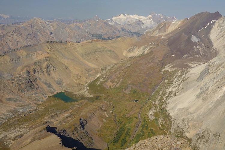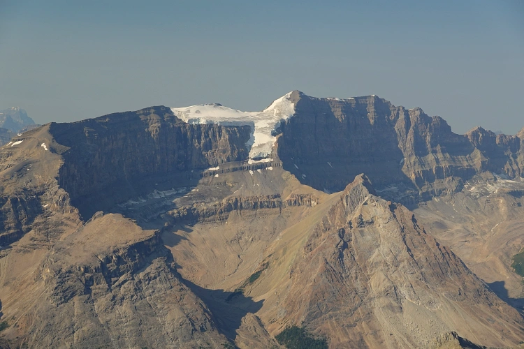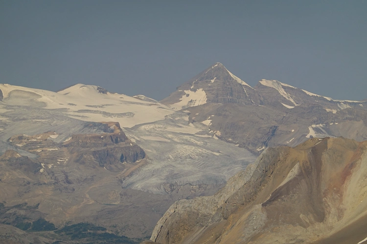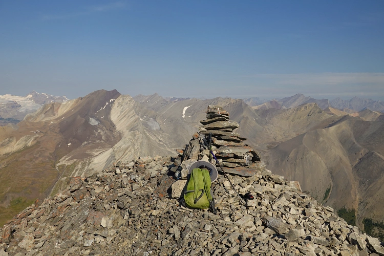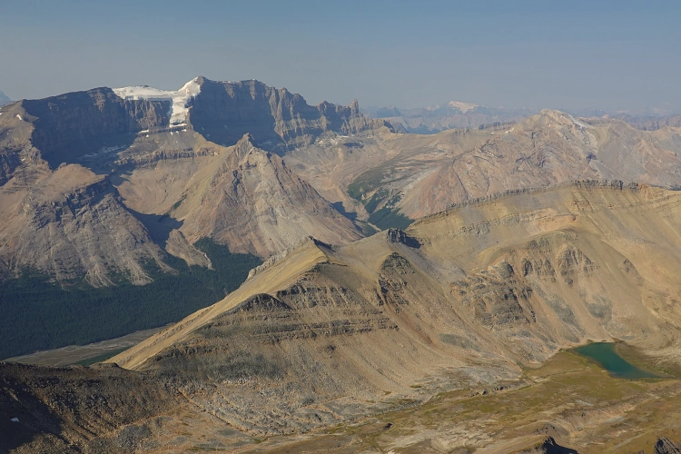 In the cluster of snow-covered peaks to the northwest is Mount Brazeau (3470 m). The brown peak on far right is Isaac Peak.
