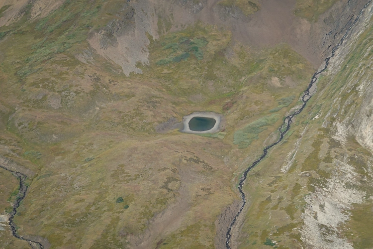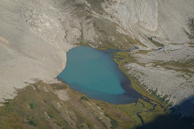 A small headwall with a turquoise tarn below leads to the south ridge of the mountain.