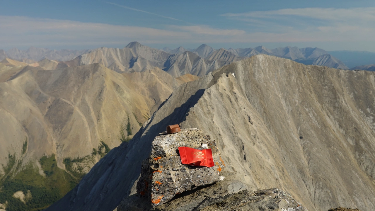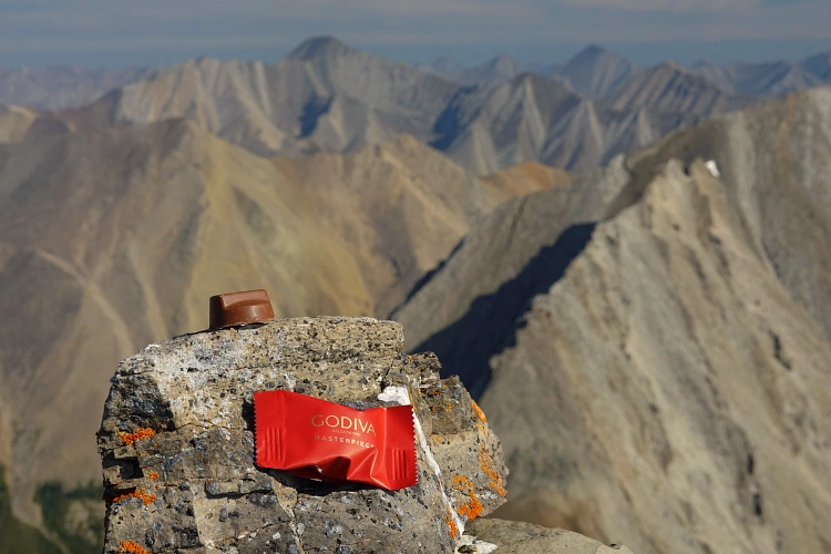 Arriving at the summit shortly after 10:30 am another surprise awaited: crowning the summit was a big cairn – it looked quite old and may have been built by an early surveyor’s party. Tucked away inside the cairn I found a new-looking register: two fellow adventurers had climbed the mountain in 2020 via the west side from Poboktan Creek Trail. I guess I’m not the only one who loves chocolate this much!
