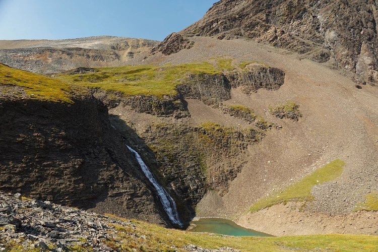 The headwall between my tent and valley bottom had a beautiful waterfall gushing down the middle. At its base the terrain flattened out and I was able to easily stroll along the west side of the creek on grassy ground, avoiding all of the shrubs on the other side of the valley. I made quick progress as I walked north to the start of the next valley coming in from the left. Again there was a lower headwall that was easily climbed, partly on grass and partly up rocky ribs, with faint game trails pointing to the path of least resistance up and over the various bumps. I entered a beautiful valley with a meandering creek and some small, shallow ponds in the middle. Now, my worries and concerns had all but dissipated… I felt this special bliss of being really privileged to see such a pristine and awe-inspiring landscape, one that few ever get to see. Skirting around the north side of the ponds, I got to the upper headwall which was attained by way of a goat trail across scree on the south side. Another small waterfall running down the middle gave me certainty that there were plenty of re-fueling stations on the way – essential on a hot day like today (31 degrees forecast for Jasper!). At the top of the higher headwall I filled up my two 1 litre bottles one last time and then started the climb of the long south ridge of Chocolate Mountain.