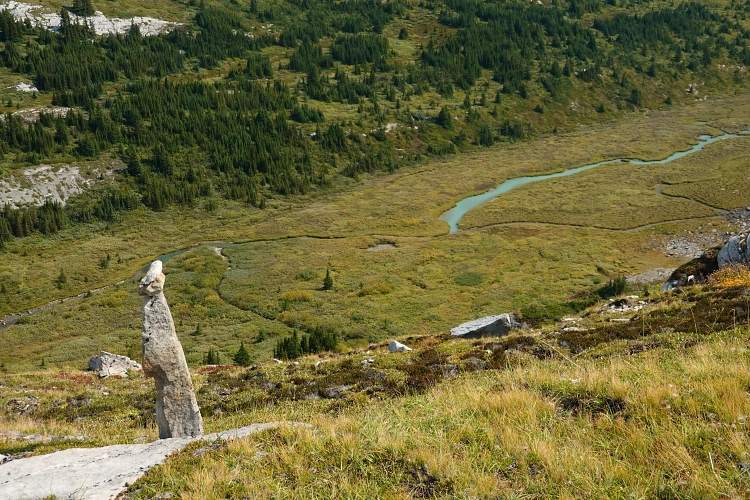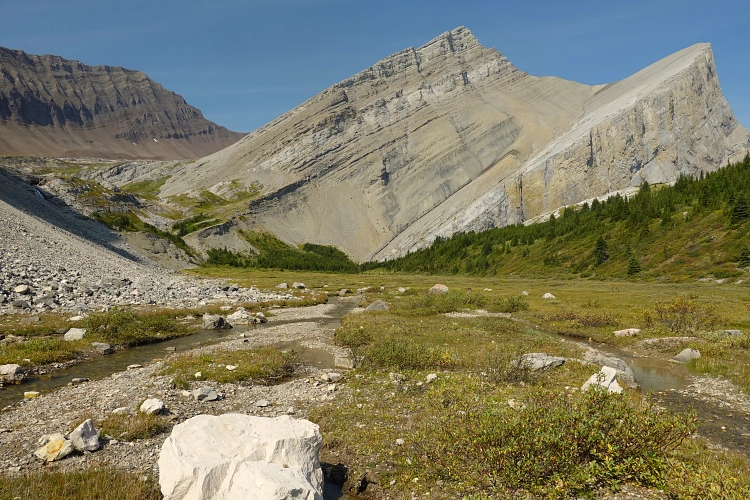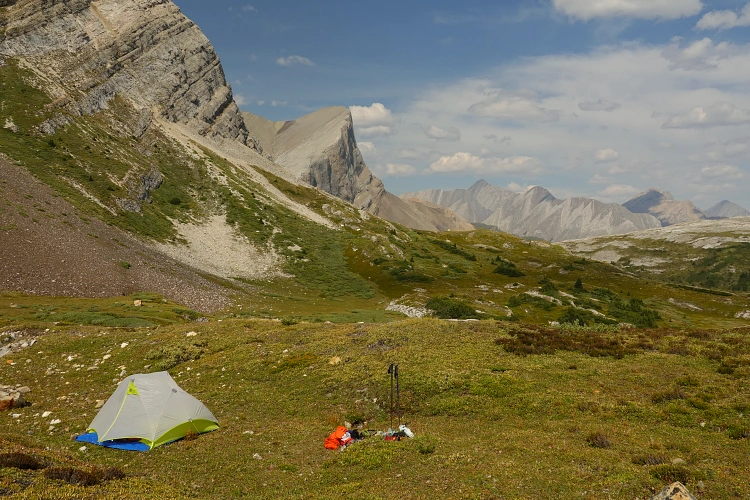 I’ve described the long approach in detail in my Mount Aztec and Mount Olympus trip reports, which cover the first two days of this four-day backpacking adventure. My basecamp for Chocolate Mountain was high up at 2300 m in a broad alpine valley, well above treeline, in a lovely meadowy area with lush green grass near a creek fed by a glacier higher up. What struck me was that in the entire valley, plus the valleys I travelled through to get to Chocolate Mountain, there were absolutely zero remnants of human presence – no cairns, fire rings, or markers. One possible exception to this was an odd arrangement of at least 10 stones in the ground, spaced out evenly and forming a straight line… I came across this near my tent, possibly an old indigenous marker?