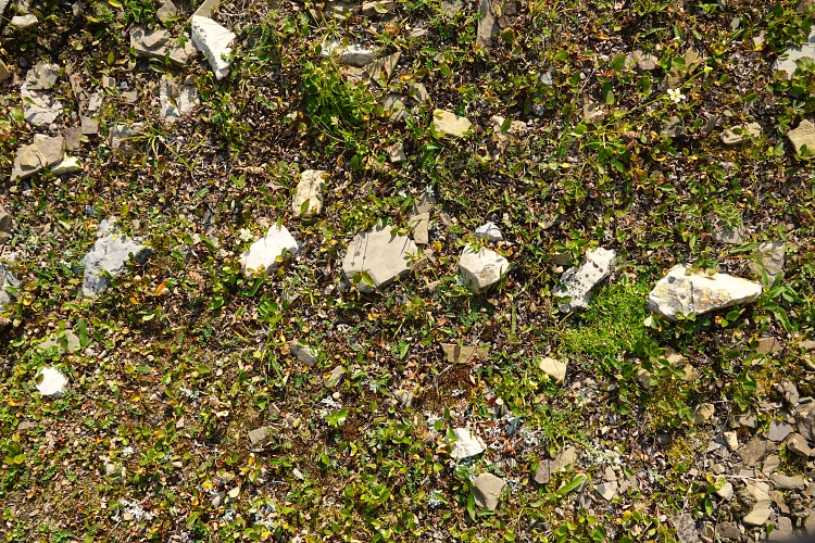 A bizarre arrangement of evenly spaced rocks in a straight line, with what looks like an arrow at the end. There were 3 or 4 more rocks on the left side.