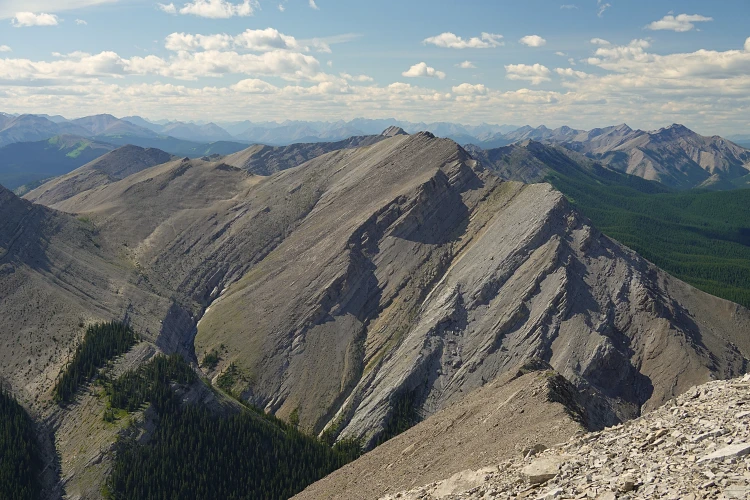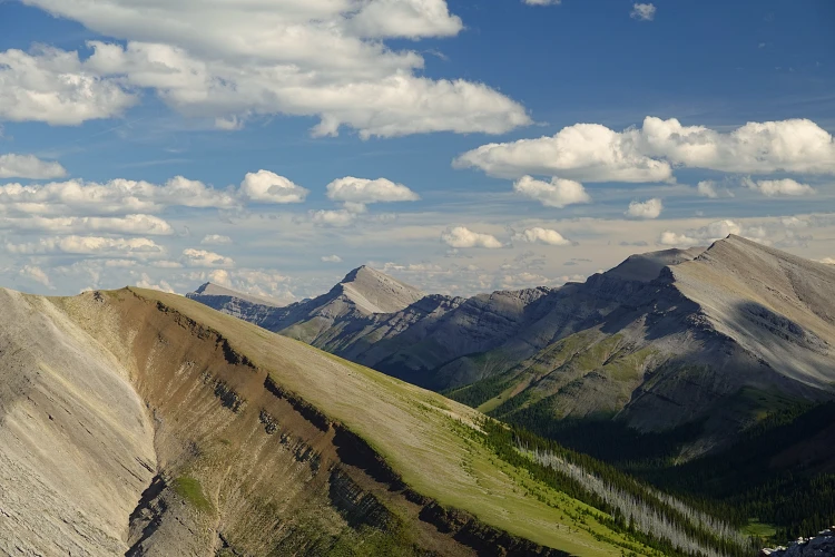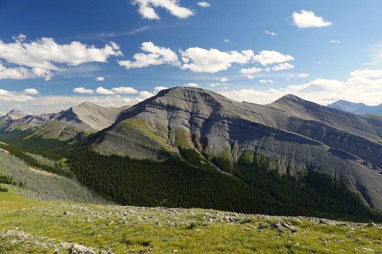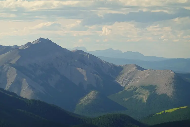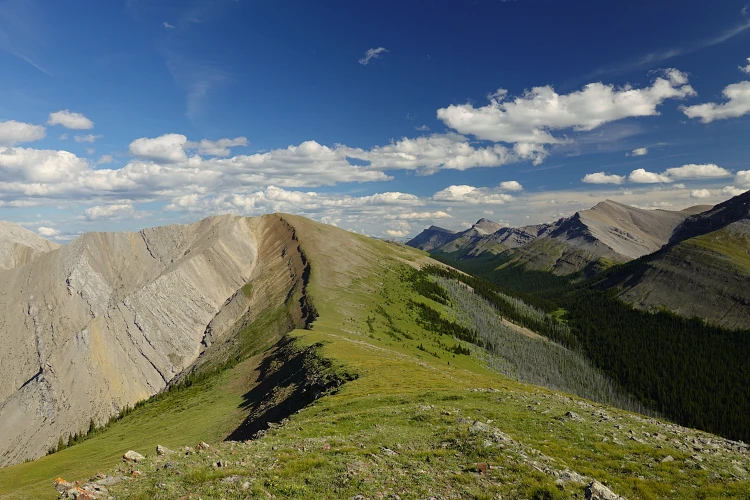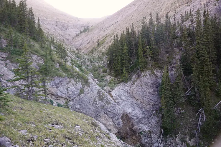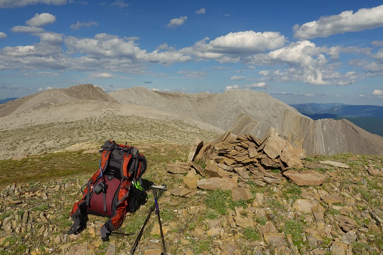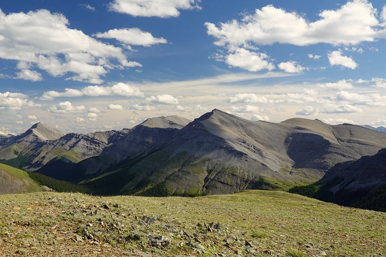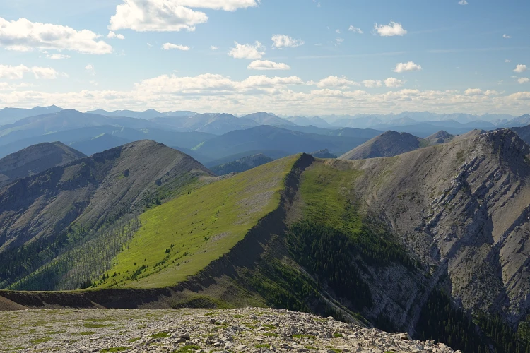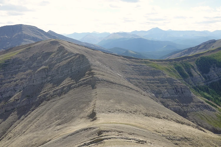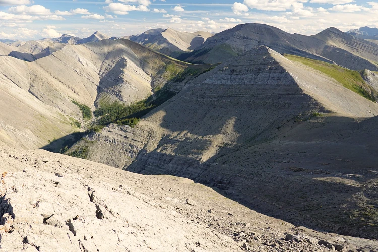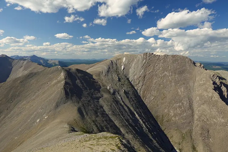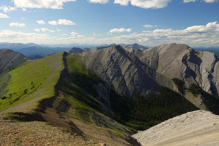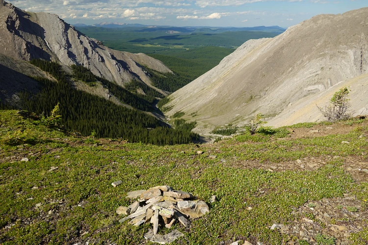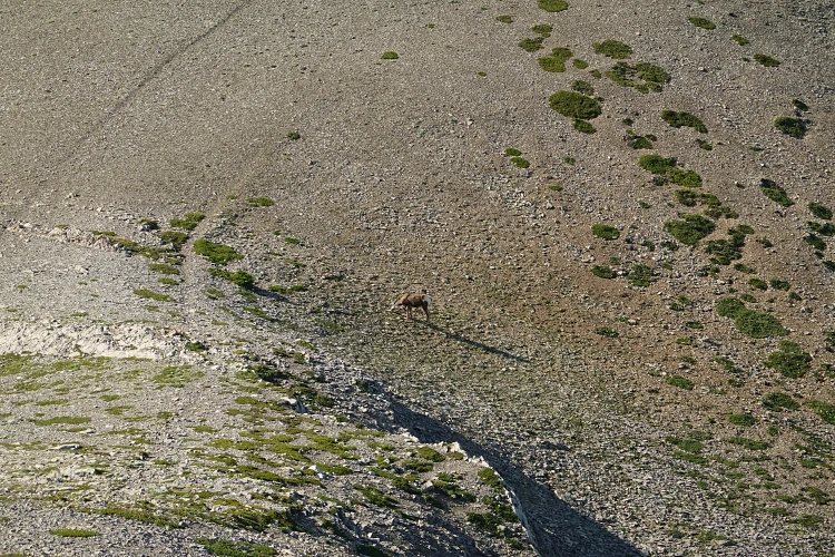 There were no major hurdles and almost all of the route to Crescent was a hike, with a few sections of easy scrambling thrown in. Occasional goat trails made it easier to navigate around bands of broken up rock. At the low point along the ridge, almost half-way between the two peaks, I came across an old, flat cairn that looks like it marks the point where you could descend down the east side of the ridge if you had to bail. On the west side the slopes are gentle and grassy, and in theory you could hike down that valley to reach Ranger Creek although that would leave you a long way from your car with no easy way to get back.