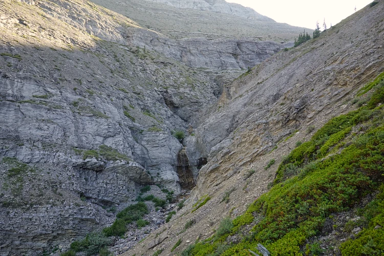 From the summit of Peppers Peak, I decided to extend my day by exploring a way to get to the next major summit to the north, which I refer to here as “Crescent Peak” after Crescent Creek further east. A straightforward way to get there is the long ridge that curves around the valley between the two peaks. It turns out this is an absolutely delightful ridgewalk that takes you over a series of high points and saddles made up of red shale, broken up grey limestone, and verdant green meadows. It also added at least four hours to my day, and there’s not source of water on this route until you’re almost back in the valley again.