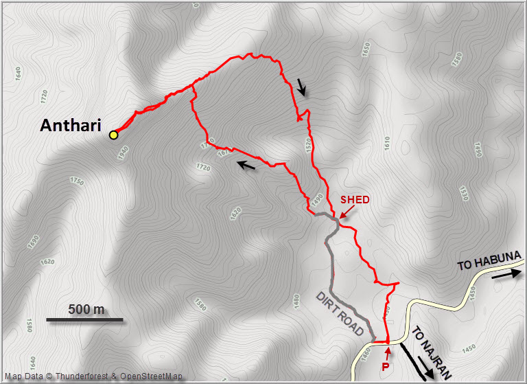 I returned the same way, carefully downclimbing the crux, then continuing down the NE ridge to an obvious drainage on the right (south). This drainage avoided the ups and downs I had encountered on my ascent ridge, but on the flipside it was pretty steep and rubbly and had several water-worn cliffs blocking the way. Fortunately, it was always possible to scramble around these cliffs either on the right or (mostly) the left. At the bottom of the drainage the small valley I was in led me back to the end of the dirt track by the shed, which I easily followed back to the main road.