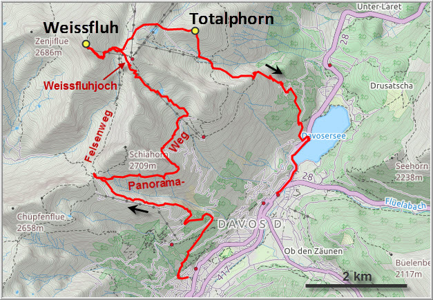 Scree slopes below the summit allow a fairly rapid descent to a hiking trail below, which took us down to the eastern edge of Davos town in a couple of hours. Our low expectations on today’s hike had been met – there’s not much to hiking up the Weissfluh and the mountain by itself doesn’t make for an attractive destination. If it wasn’t for the lovely Panoramaweg and the short scramble on the Totalphorn I probably wouldn’t recommend this trip at all.