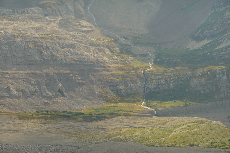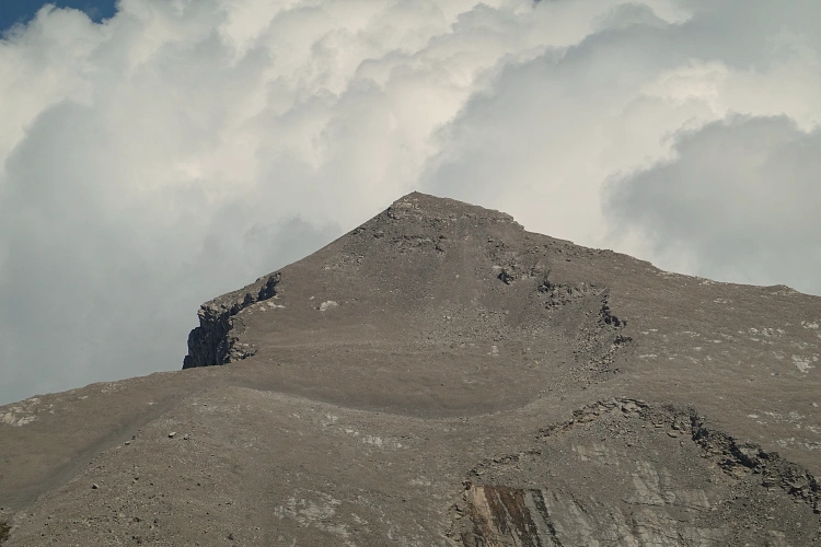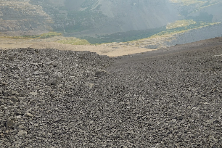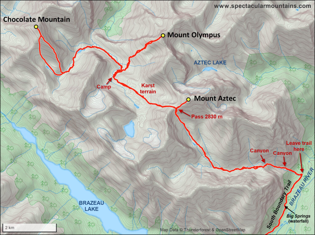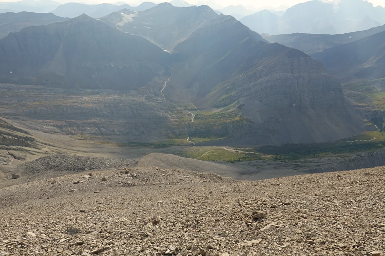 There are several peaks with the name Mount Olympus in the Rockies, but for this particular one I couldn’t find any information at all. It sits on the eastern end of the broad valley where I set up camp, about 2.5 km north of Mount Aztec. The satellite images I looked at before my trip indicated it might be an easy plod up west-facing scree and slabs, but of course you never really know until you stick your nose into it as the higher granularity details are typically lost in satellite imagery and even a 5 metre vertical cliff band can be a showstopper.