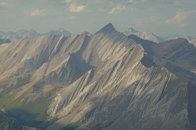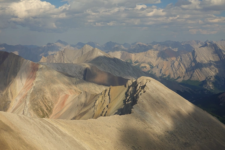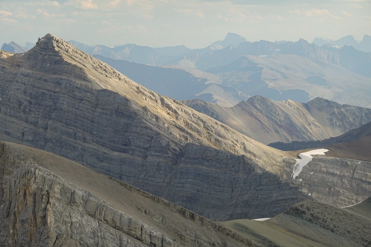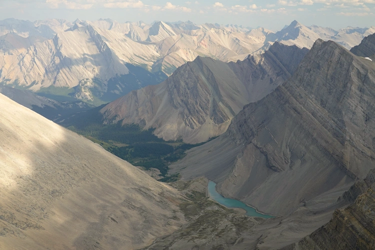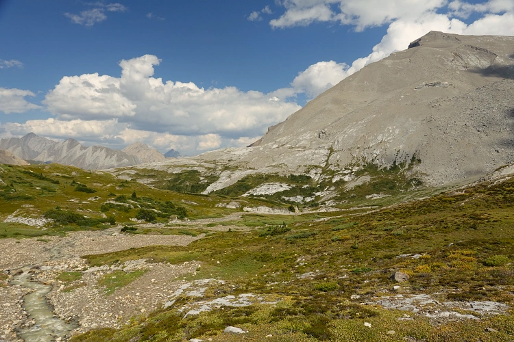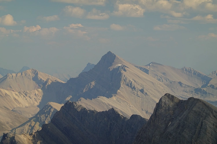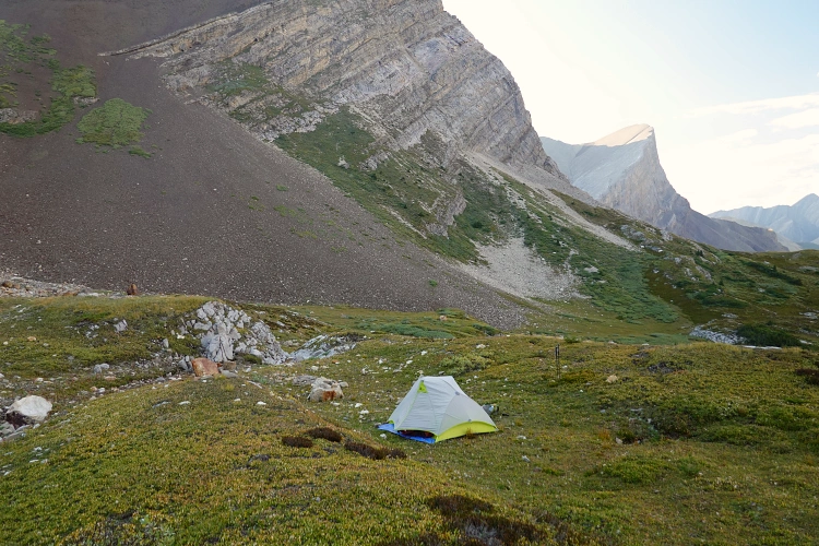It was only 3 pm when I finished setting up my tent and having a late lunch of beef jerky and pumpernickel in the lonely but beautiful broad valley northeast of Brazeau Lake in Jasper’s remote backcountry. I had just come over the high col west of Mount Aztec and climbed that mountain from the pass. The weather looked great, with only a few clouds around, it was hot, and I still had energy left, so I decided to “go for a stroll” with my light daypack and see how far I could get in ascending nearby Mount Olympus.