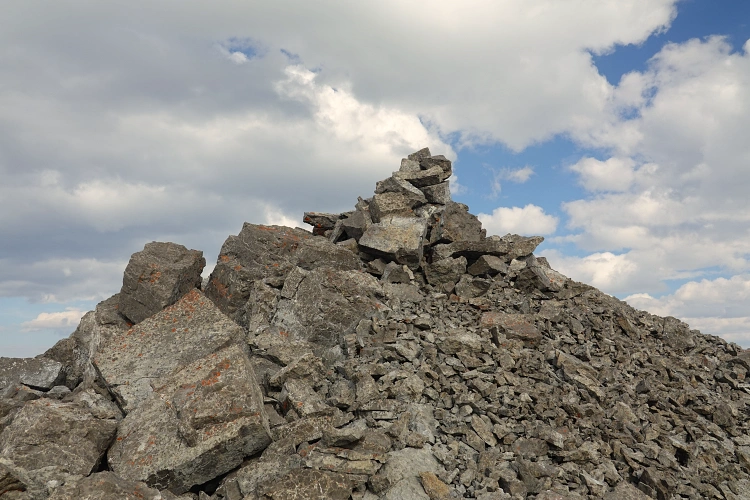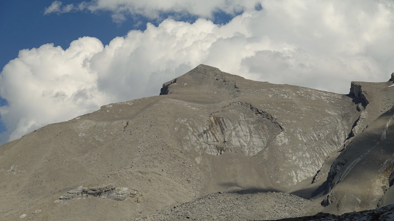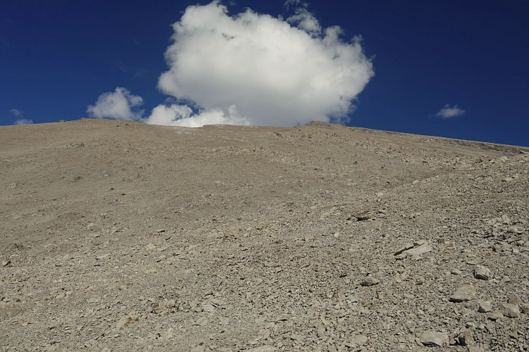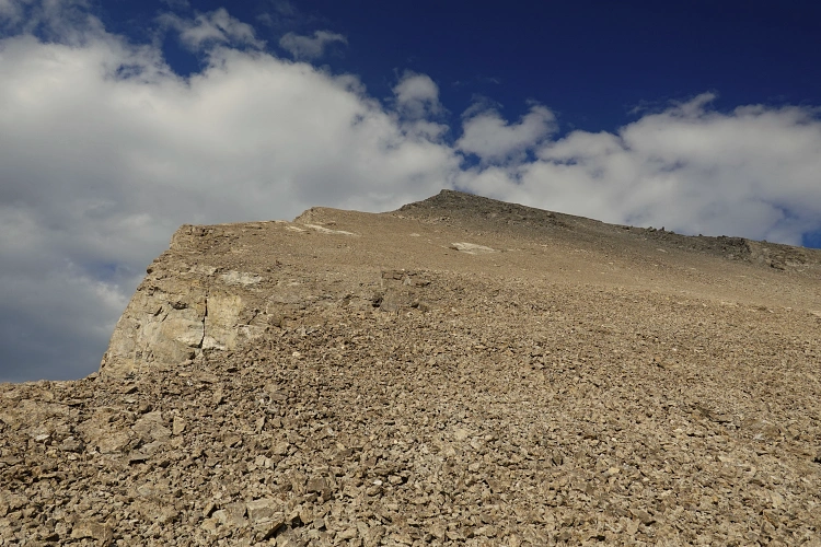 It turns out Mount Olympus had none of those and the route I picked worked out really well. After dropping down into the bottom of the valley below a small headwall near a pretty waterfall, I crossed a barren plain of rubble and shrubs before angling up the mountain’s southwest slopes on grassy patches to get as high as I could. The slope above is a mixture of solid slabs, loose fine scree, and relatively firm talus of slightly larger size. The slabs were steep but great to efficiently walk up on, while the talus was coherent enough not to make it a treadmill exercise. I slowly picked away at the terrain until I reached the west ridge about three quarters of the way up. It got a bit steeper and a bit more loose here, but with no difficulties to speak of. About two hours after leaving camp I stood on the summit of Mount Olympus, crowned by yet another old and stately cairn (but no register). I wonder if it was an old survey party that built the cairn in the early days?
