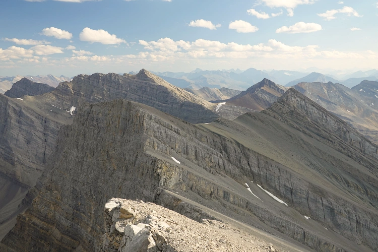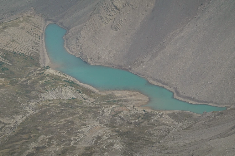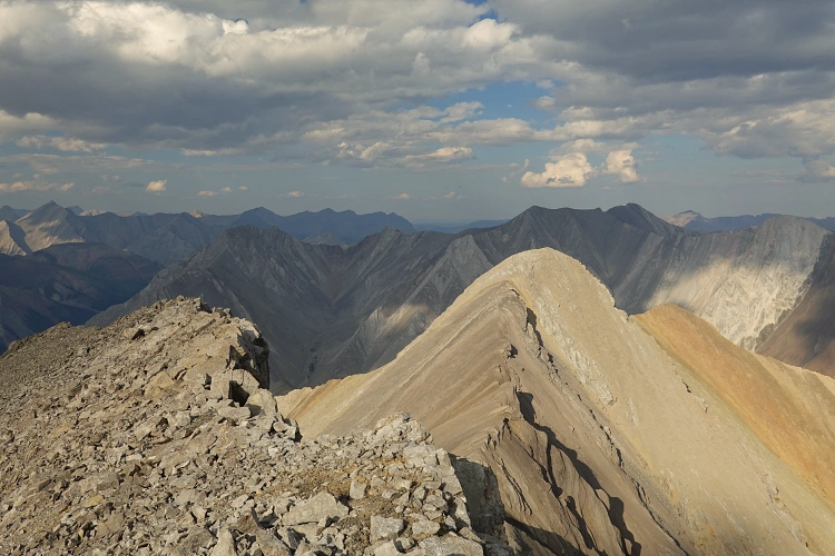 Highlights at the summit – other than the joy of completing my goal – included a peek at rarely seen Aztec Lake down the east side of the mountain (better views than from Mount Aztec), the even more remote Copia Peak to the north, and a sea of unnamed mountains to the east stretching as far as Chungo Lookout in the front ranges of the Rockies.