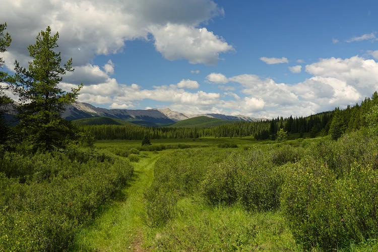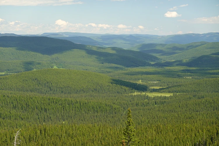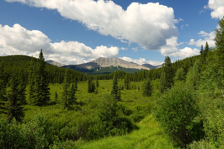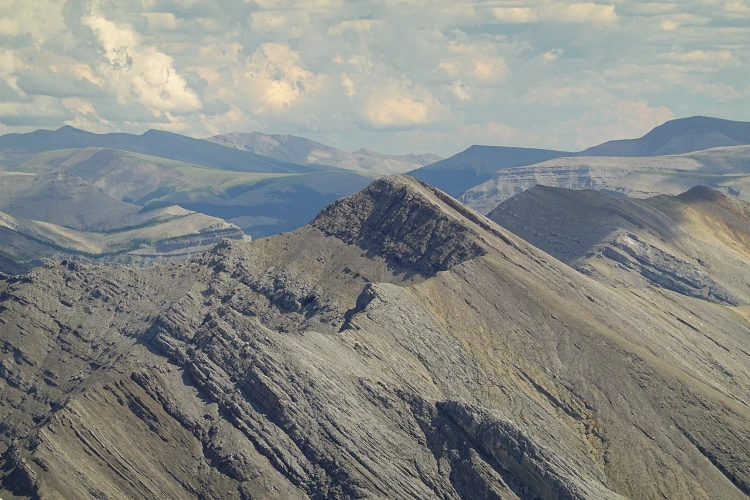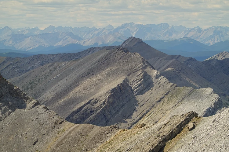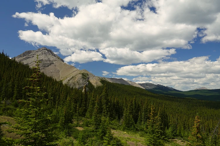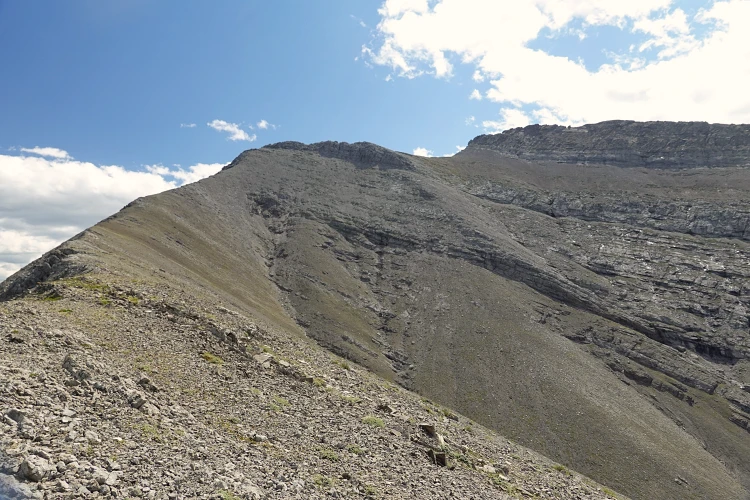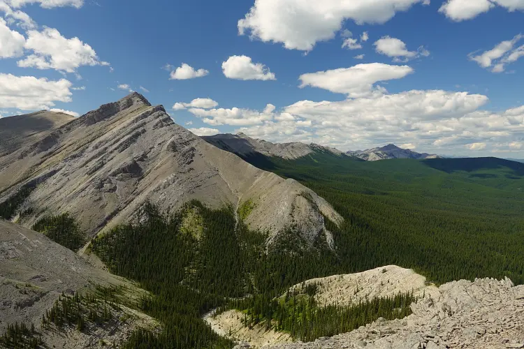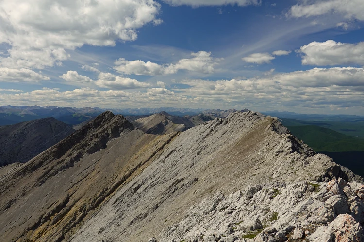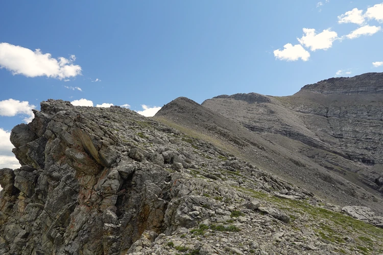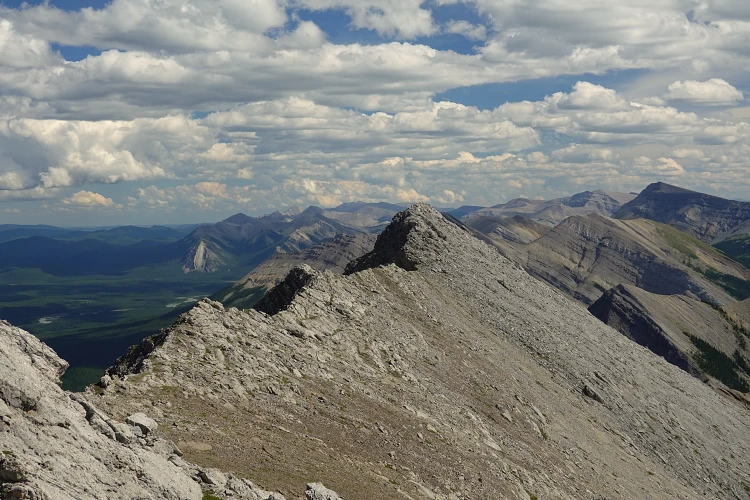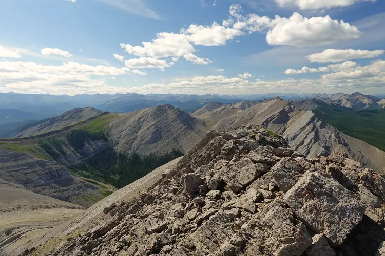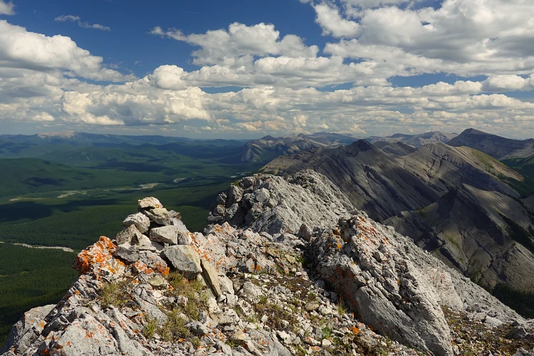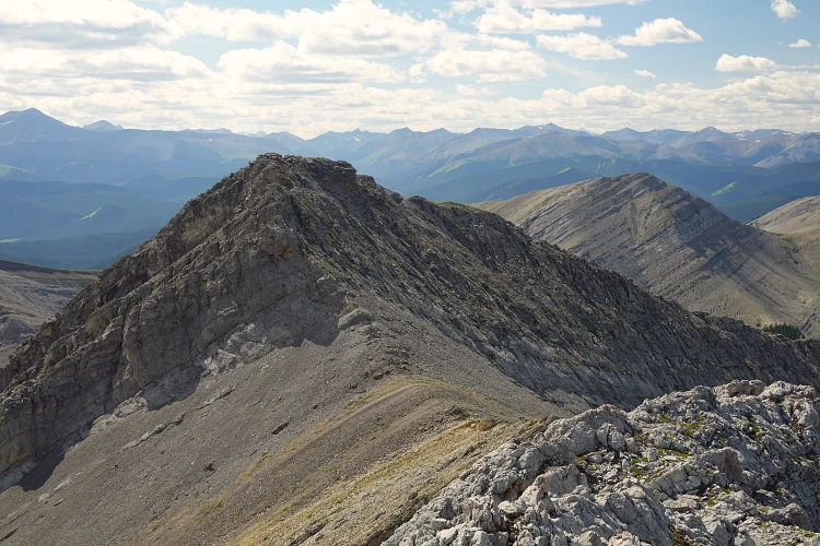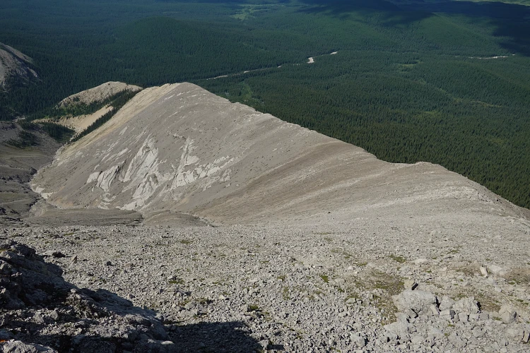 After several hours of biking, pushing, wading, and finally dumping my bike and hiking, I reached the end of the long east-west cutline that goes almost to the start of the ascent ridge, the north ridge. There was a bit of light bushwhacking, then I was on an easy and enjoyable ridge that took me directly to the central high point where I found an old, lichen-covered cairn. There is also a southern high point that’s easily reached via the pleasant summit ridge. I then continued west towards the western high point (the true summit at 2430 m), which required a few moderate steps to climb up a cliff band just below the summit. The views from up here are pretty amazing! A mix of undulating ridges of grey limestone, red shale, and lush green meadows that cover the landscape.