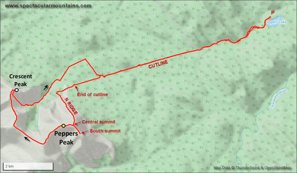 This broad, distinctive front range peak had caught my attention multiple times in past years while driving the Forestry Trunk Road between the Cutoff Creek and Hummingbird areas. It’s broad north-south ridge and steep east face can be readily seen from the section of road north of Elk Creek provincial recreational area and south of Ram Falls. Officially unnamed, I decided to dub it “Peppers Peak” after Peppers Lake that sits just to the east.