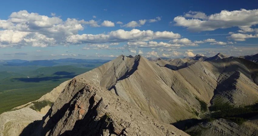 After several hours of biking, pushing, wading, and finally dumping my bike and hiking, I reached the end of the long east-west cutline that goes almost to the start of the ascent ridge, the north ridge. There was a bit of light bushwhacking, then I was on an easy and enjoyable ridge that took me directly to the central high point where I found an old, lichen-covered cairn. There is also a southern high point that’s easily reached via the pleasant summit ridge. I then continued west towards the western high point (the true summit at 2430 m), which required a few moderate steps to climb up a cliff band just below the summit. The views from up here are pretty amazing! A mix of undulating ridges of grey limestone, red shale, and lush green meadows that cover the landscape.